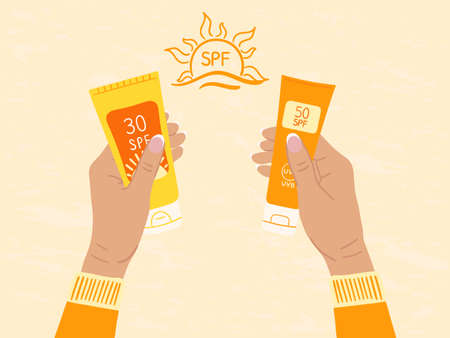 Set of sunscreen bottles, tubes with different SPF from 30 to 50 in female hands. What to choose. Sunscreen protection and sun safety. Hand drawn organic vector illustration.