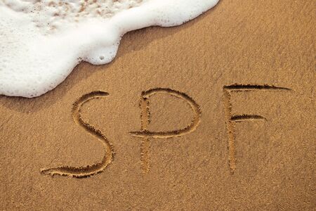 Written word SPF on sandy beach close to sea wave, sunblock skin protection concept.