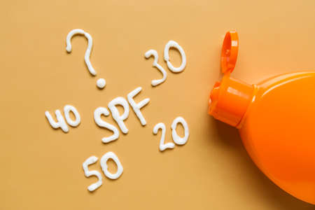 SPF inscription from sunscreen. Text and cream tube on a solid orange background