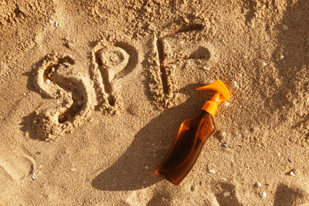 sun protection factors. The word SPF is written on the sand and next to it is a yellow bottle of sunscreen. The concept of sea holidays and skin care.