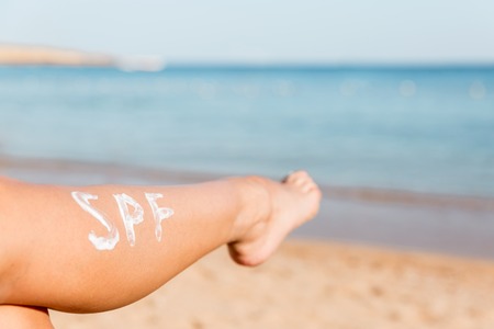 Female legs with spf word made of sun cream at the beach. Sun protection factor concept.