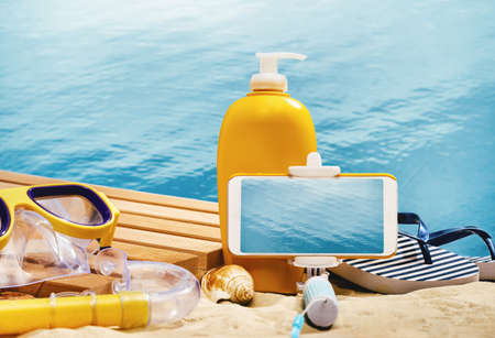Closeup of sunscreen protection set on sandy beach at tropical seaside on warm sunny day. Skin care concept