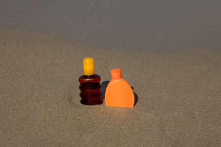 two bottles of sunscreen with shell and sunglasses on the beach.summer sunbath - suntan oil