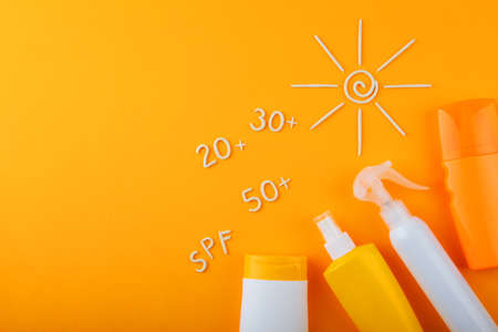 Sunscreen on orange background. Plastic bottle of sun protection and white heart-shaped cream