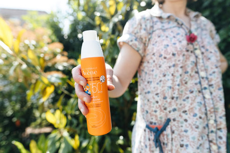 Woman holding avene kids spf50 in garden