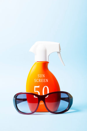 50 protection sun cream with sunglasses. Sun protection concept, summer
