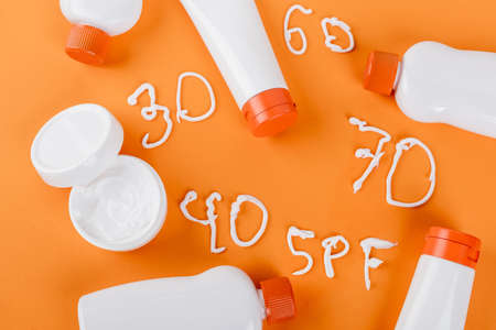 top view of sunscreen and cosmetic cream near different numbers and spf lettering on orange