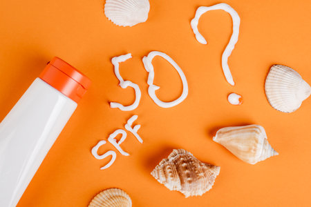 top view of sunscreen near seashells, spf lettering and number fifty with question mark on orange surface