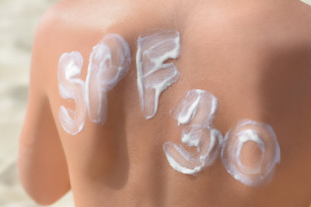 Child with abbreviation SPF 30 of sunscreen on back at beach, closeup