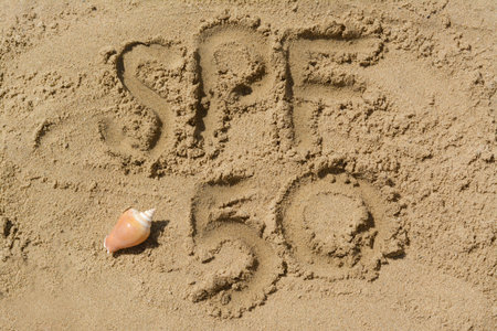 Abbreviation SPF 50 written on sand and seashell at beach, top view