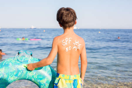 Child, preteen boy with sun protection cream on his back on the beach, holding inflatable ring
