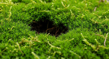 Lush green moss forming a circular opening with a dark center, detailed macro view.