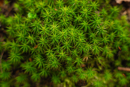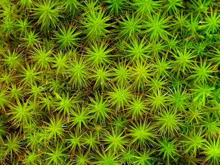Close-up of vibrant green moss in forest - natural texture and pattern of star-shaped moss plants
