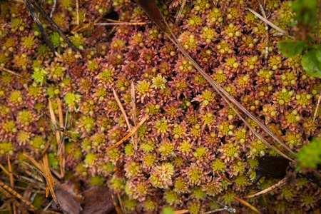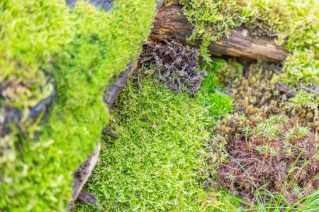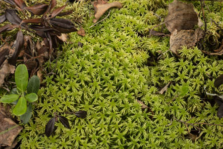 Beautiful background with green moss or musk and variety of little plants and leaves on the ground in the undergrowth of a forest or woods in autumn. Bottom view, close up