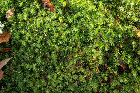 Bright green moss background. Saturated green abstract pattern. Shallow focus. Filled full frame picture. Moss with autumn wilted brown leaves. side view