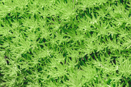 Close-up of light green succulent sedum leaves background texture.