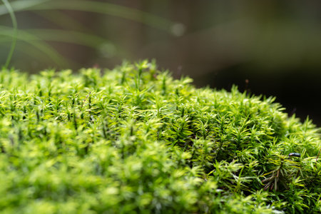 A beautiful, vibrant, fresh moss in the forest after the rain. Shallow depth of field closeup macro photo.