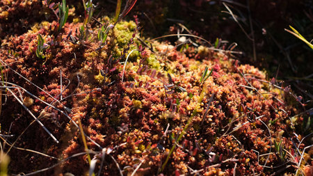 Close-up image of a colorful sphagnum moss carpet in a bog habitat, showing its natural textures and vibrant hues of red, yellow, and green