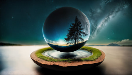 Epic landscape with sphere over lake, mountains and night starry sky. Generative ai