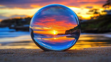Crystal ball capturing an ocean sunset, resting on warm beach sand with vibrant reflections of orange, pink, and purple sky