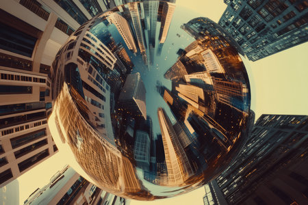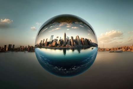 A surreal reflection of a city skyline in a giant glass ball, distorting the image and creating impossible angles.