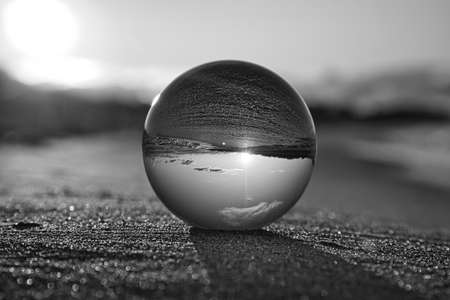 Glass globe on the beach of the Baltic Sea in Zingst in which the landscape is depicted. Implemented in black and white.