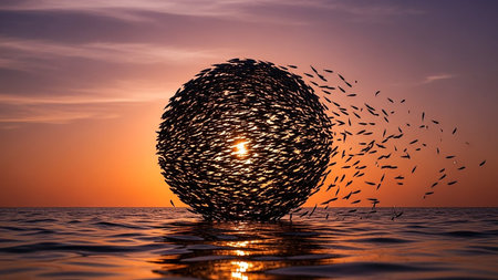 A large flock of starlings forms a perfect sphere over the ocean during a vibrant sunset.