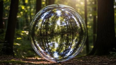A reflective sphere sits in the middle of a dense, green forest. The sphere mirrors the surrounding trees and sunlight, creating a mesmerizing and ethereal effect.