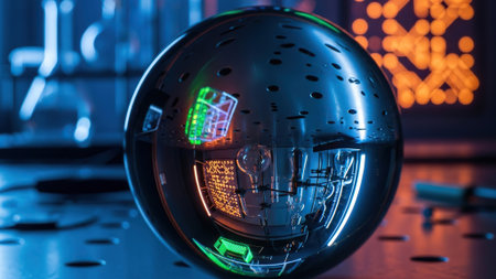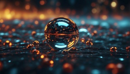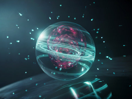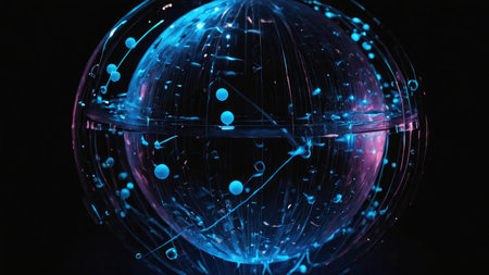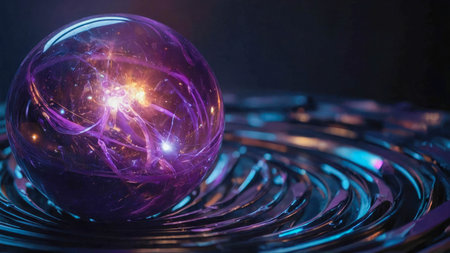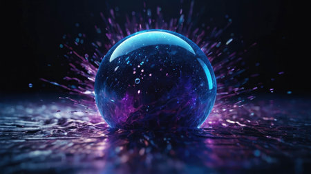 Glass energy abstract sphere with particles and glowing lights on a dark background.