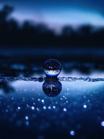 A solitary raindrop rests on a surface, capturing and reflecting the beauty of a starry night sky with deep shades of blue and shimmering light.