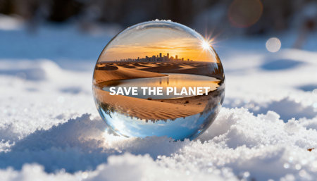 Glass orb reflects desert dunes and a distant city skyline with the words SAVE THE PLANET visible, set on textured snow with bright sunlight and bokeh, with open snow areas offering space for text or design elements