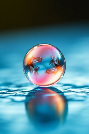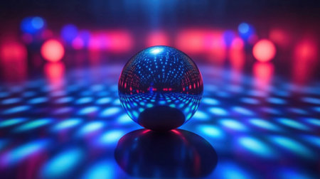 A mesmerizing reflective sphere sits on a colorful surface, illuminated by vibrant lights, casting abstract patterns and creating a dreamlike atmosphere.