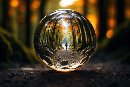 Man walking in the forest through a crystal ball. Conceptual image.
