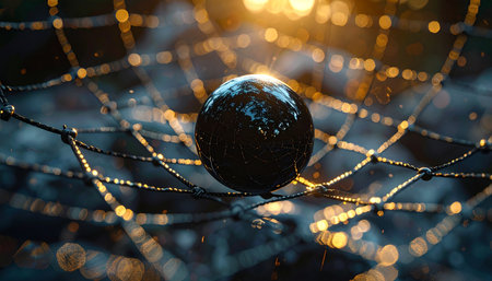 A single sphere, representing a world of data, is caught in a luminous digital web.