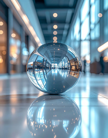 A large chrome sphere rests on a polished floor, capturing and distorting the clean lines of a modern building.
