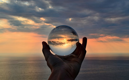 Magic sphere. Fortune teller, mind power concept. Crystal Ball reflecting water and sky.