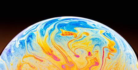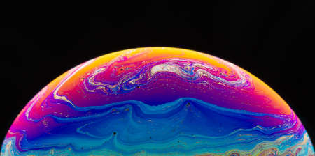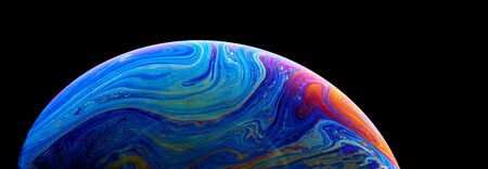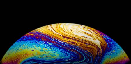 Close up picture of half soap bubble psychedelic color on black background look like colorful liquid planet in another galaxy
