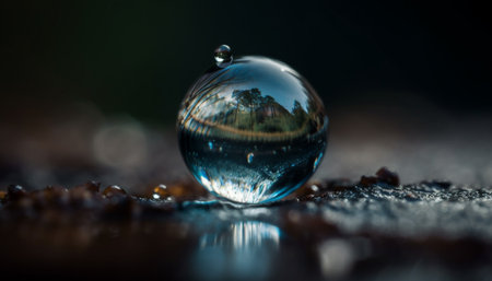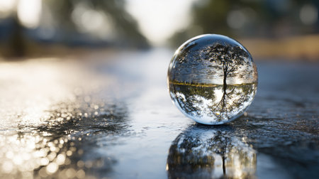 A clear sphere sits on a wet surface, reflecting a distorted image of trees and a blurred background. The composition features a shallow depth of field, with soft focus elements and natural lighting. This image could be used for various projects, including those related to nature, environment, or abstract concepts.