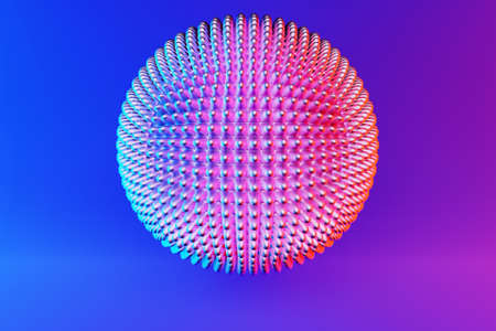 3D illustration of a metal ball with many faces and spikes, crystals scatter under neon lights on a pink and blue background. Cyber ball sphere