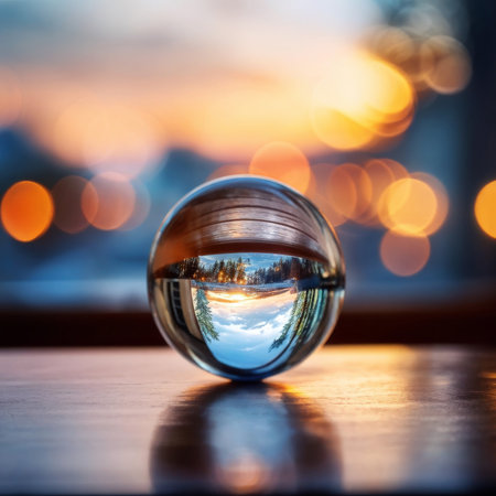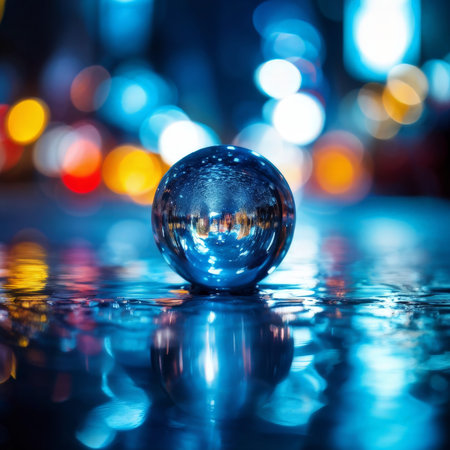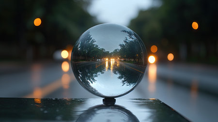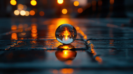 Reflection of City Lights in a Glass Sphere on Wet Pavement at Dusk with Bokeh Background Effect