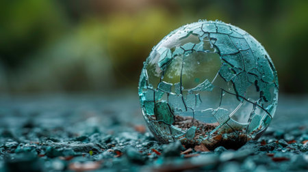 Earth depicted as a transparent glass globe, with cracks and imperfections symbolizing the planet's vulnerability to human actions