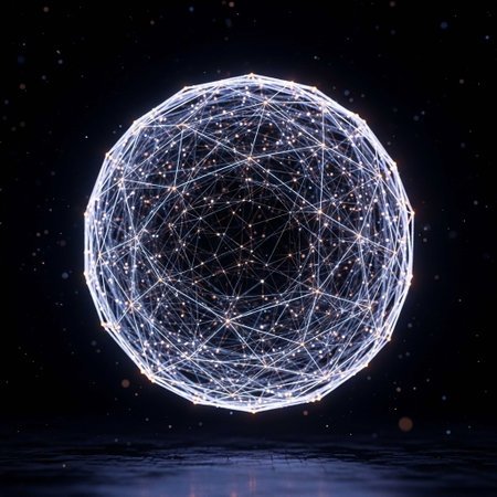 A crystalline globe crafted from shimmering blue nanoparticles where fluctuations in network traffic manifest as rhythmic pulses suggesting a heartbeat of technology