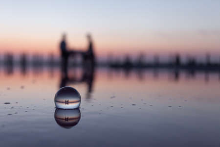 Abstract idea with water with an interesting effect. Glass ball on a blurred background on a seaside beach in Gdynia, Poland. Photo with a shallow depth of field.