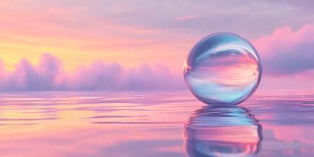 A surreal 3D background featuring a giant glass sphere floating over a mirror-like water surface, reflecting the mesmerizing hues of a sunset sky. The dreamlike scene captures the essence of tranquility, minimalism, and ethereal beauty.