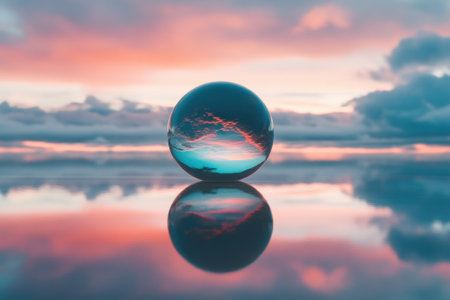 A glass orb reflects a colorful sunset, creating a striking visual effect over calm waters.