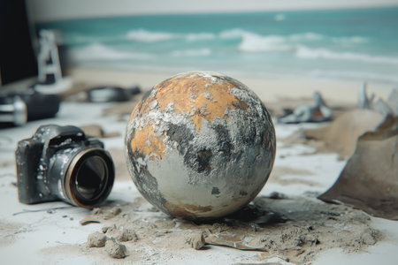 A detailed planet model sits on a sandy surface next to an old camera in a beach-themed setup.