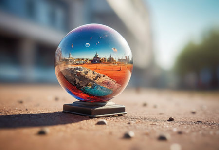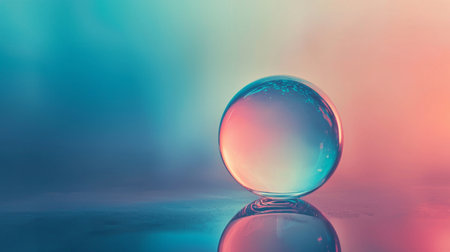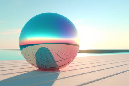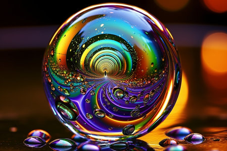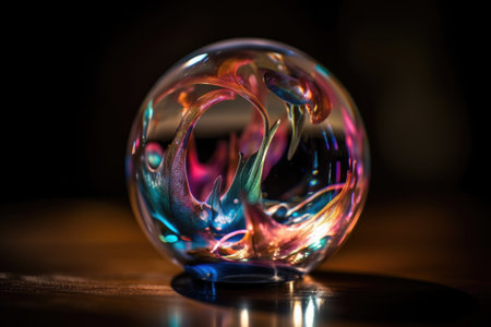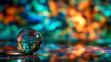 A vibrant and colorful glass sphere reflecting beautiful and vivid hues on a calm and tranquil surface