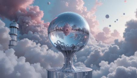 A surreal 3D background featuring a giant glass sphere floating over a mirror-like water surface, reflecting the mesmerizing hues of a sunset sky. The dreamlike scene captures the essence of tranquility, minimalism, and ethereal beauty.