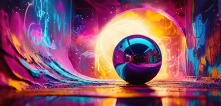 A mesmerizing reflective sphere sits on a colorful surface, illuminated by vibrant lights, casting abstract patterns and creating a dreamlike atmosphere.