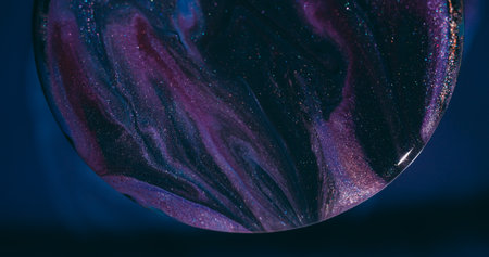 Blur paint blend. Fluorescent curve. Black purple violet sparkling emulsion in circle lens. Swirl flow spilling on color abstract background.
